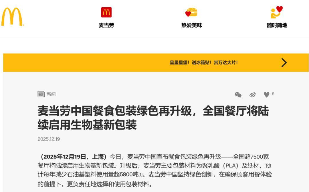 据悉,升级后,麦当劳次要包拆材料为聚乳酸(PLA)及纸材,估计每年削减石油基塑料利用量超5800吨。正在确保顾客用餐体验的前提下,更负义务地选择和利用包拆材料。